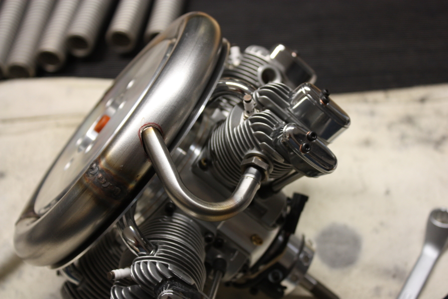 Zwischen Zylinder und Motorträger, unter Berücksichtigung der Ansaugrohre, muss jetzt noch der Ringschalldämpfer montiert werden. Leider hatte unser Keleo Ringschalldämpfer, nach dem extrem gekürzten Motorträger, nun keinen Platz mehr.