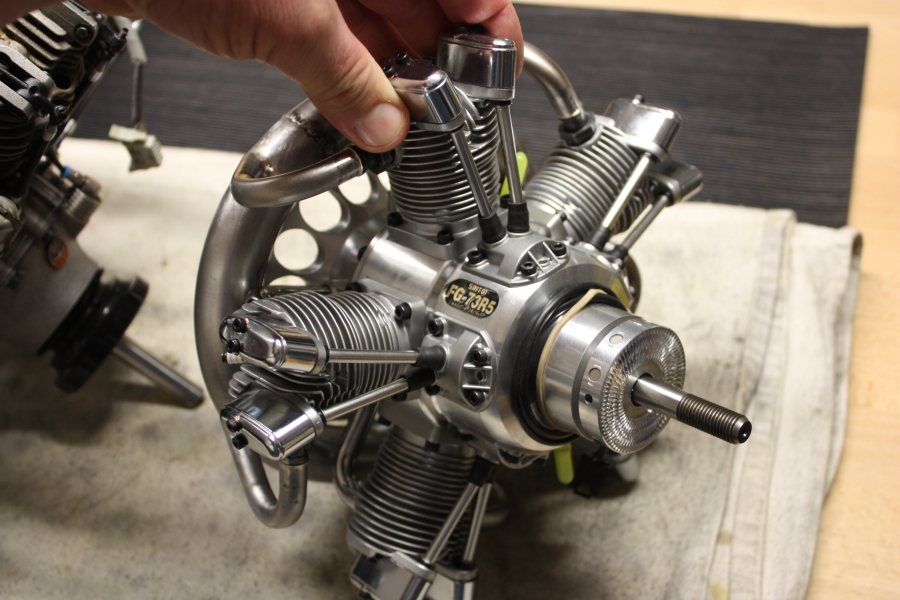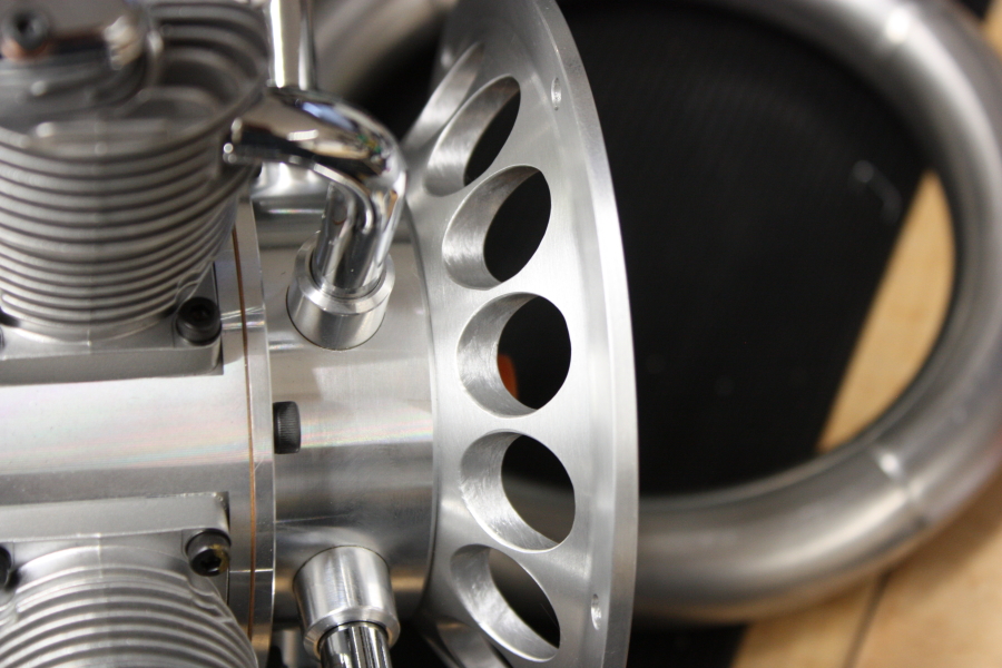 Für unser neues Projekt haben wir uns für einen Saito FG73 entschieden. Er ist perfekt verarbeitet, sieht gut aus und passt im Durchmesser und Gewicht zu unserem neuen Modell. Da unser Modell jedoch eine extrem kurze "Schnauze" hat, mussten wir den mitgelieferten Motorträger ersetzen. Wir fertigten dazu einen neuen Motorträger aus Aluminium an.