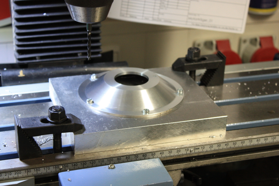 Der fertig gedrehte Flansch wurde auf der Fräsmaschine mit Ausfräsungen und Bohrungen weiterbearbeitet.
